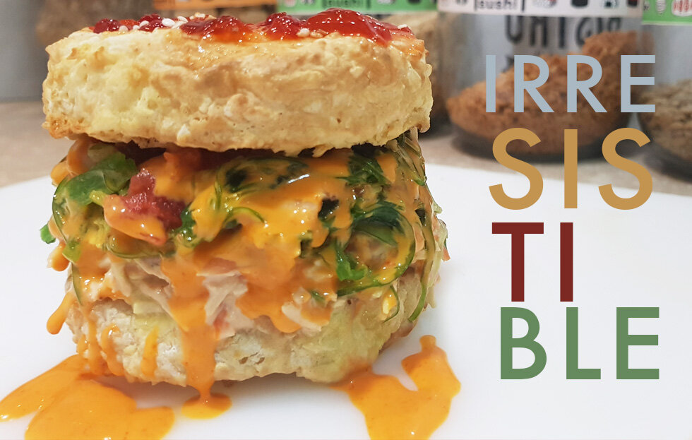 Crujiente Burger de arroz frito en tempura con salmon, surimi, wakame, aguacate, especias, pico de gallo y una increible salsa semipicante.