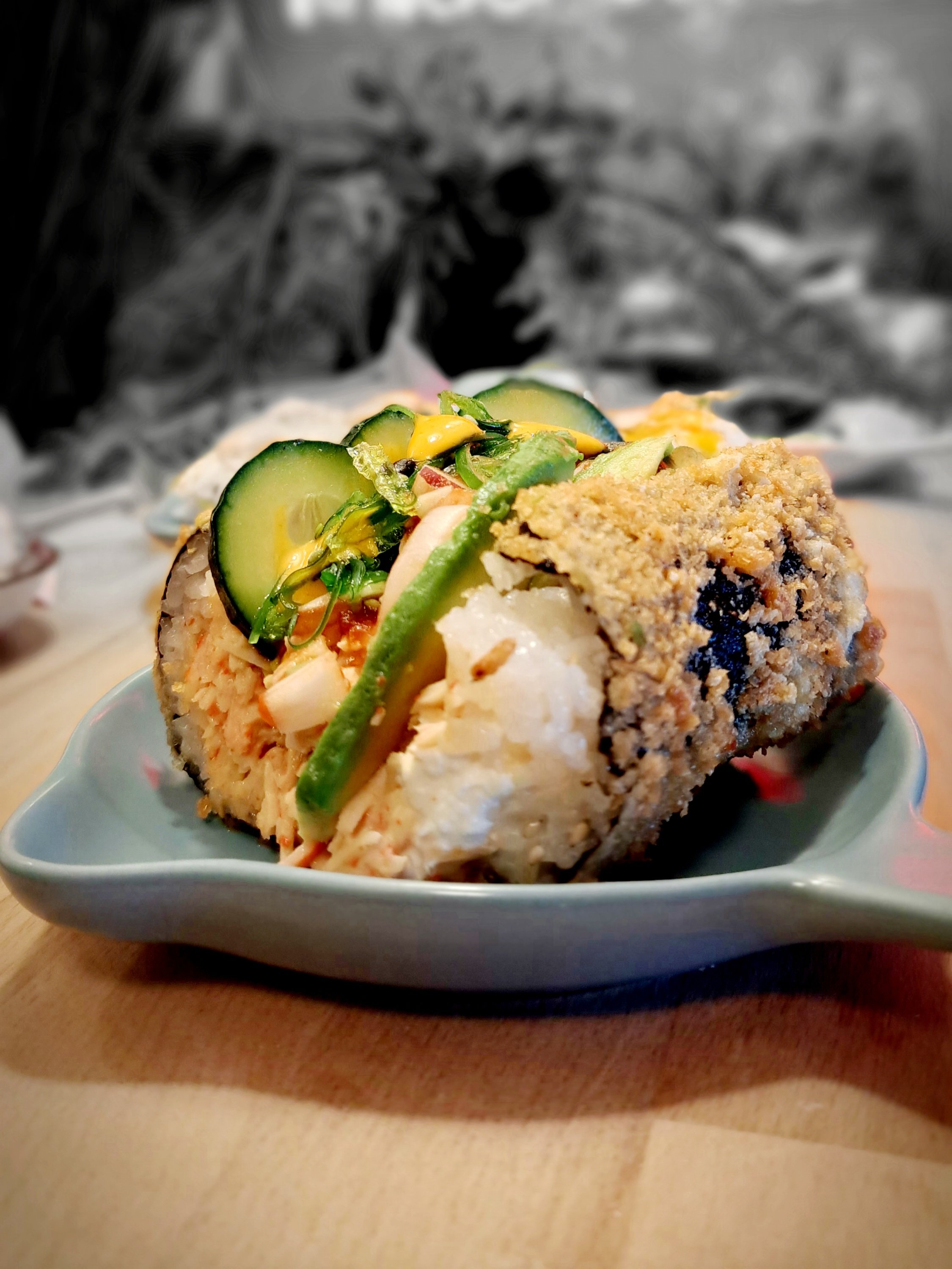 Sushiburrito rebozado en tempura y panko. con cangrejo, salmon, wakame, pepino, pico de gallo y salsa semipicante